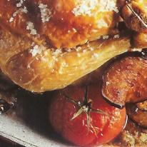 El pollo debe estar preparado, completamente vacío, y sin grasa. Lava el limón y córtalo por la mitad, seguidamente, introduce los dos trozos de limón y el romero en el interior del pollo. Ahora pela el diente de ajo y frótalo por toda la superficie del pollo. Ata los muslos del pollo para que preserve su contenido.Precalienta el horno a 200º C y dispón una fuente de horno, deposita el pollo en el centro y añade la sal a su alrededor formando una banda de unos 2 centímetros de ancho. Espolvorea el pollo con una cucharada de sal e introdúcelo en el horno durante 60 minutos.Mientras, en otra bandeja de horno, deposita los 5 tomates y las berenjenas cortadas en finas lonchas. Sala toda la preparación y añade unas gotas de aceite, introduce la bandeja en el horno junto al pollo una ½ hora antes de que finalice la cocción de la carne.Sirve cada plato combinando los ingredientes, un tomate, unas rodajas de berenjena y una porción de pollo.