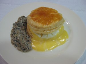 abrir los hojaldres, poner una cucharada de salsa holandesa, colocar el huevo