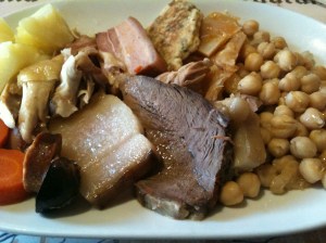 Servir primero la sopa, seguida de las verduras con los garbanzos y las carnes con el relleno.
