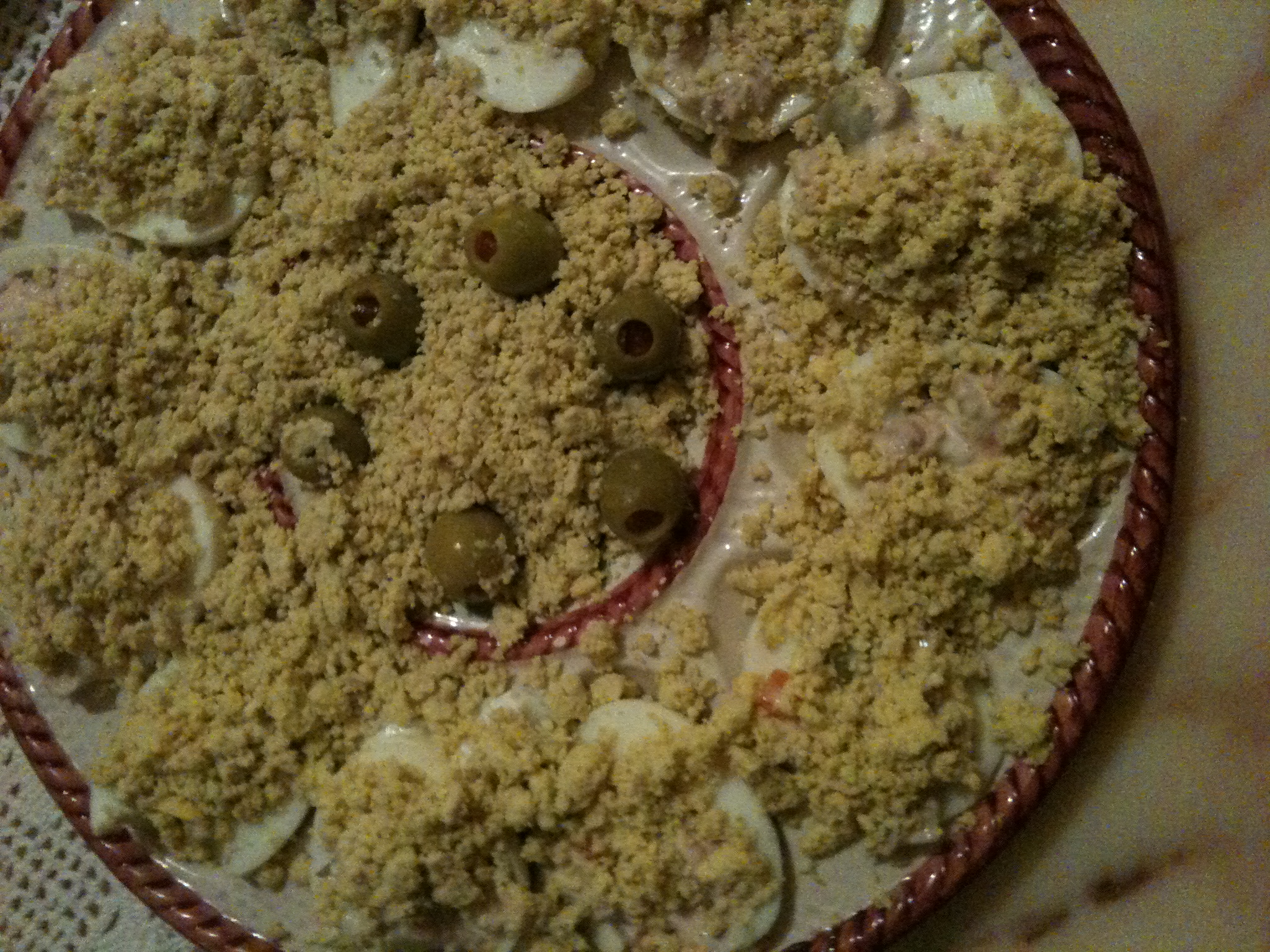 Rellenar los medios huevos con los rellenos, decorar con la yema por encima y servir.