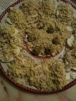 Hervir los huevos en agua con sal. Una vez cocidos, refrescarlos con agua fría, pelarlos y cortar en dos. Retirar las yemas deshacerlas con un tenedor y reservarlas.