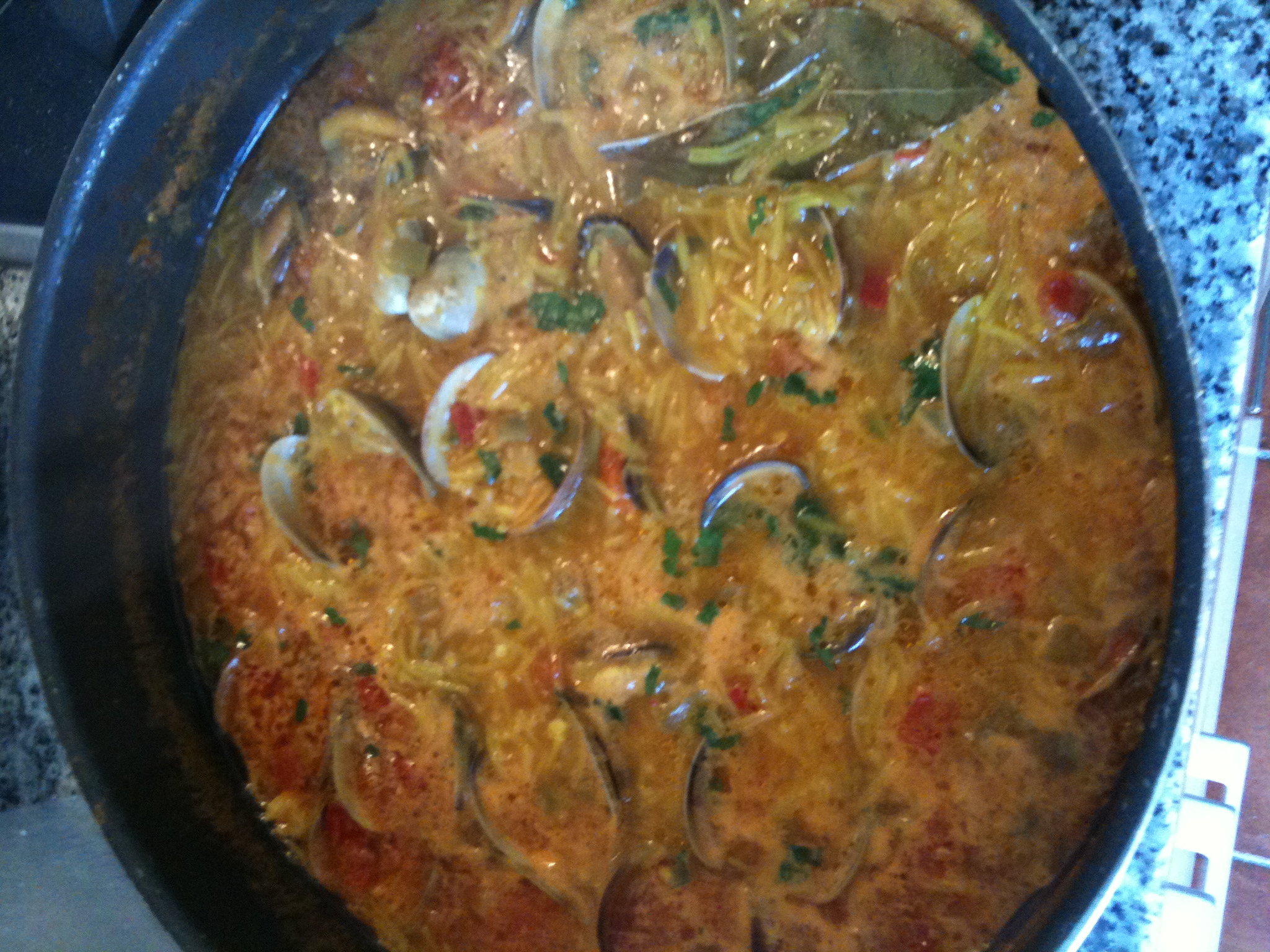 Poner las almejas bien limpias en una sartén con aceite, ajo picado y perejil picado, cuando abran se añaden a la cazuela junto con los fideos. Salpimentar al gusto. Cuando los fideos estén en su punto retirar y servir inmediatamente.