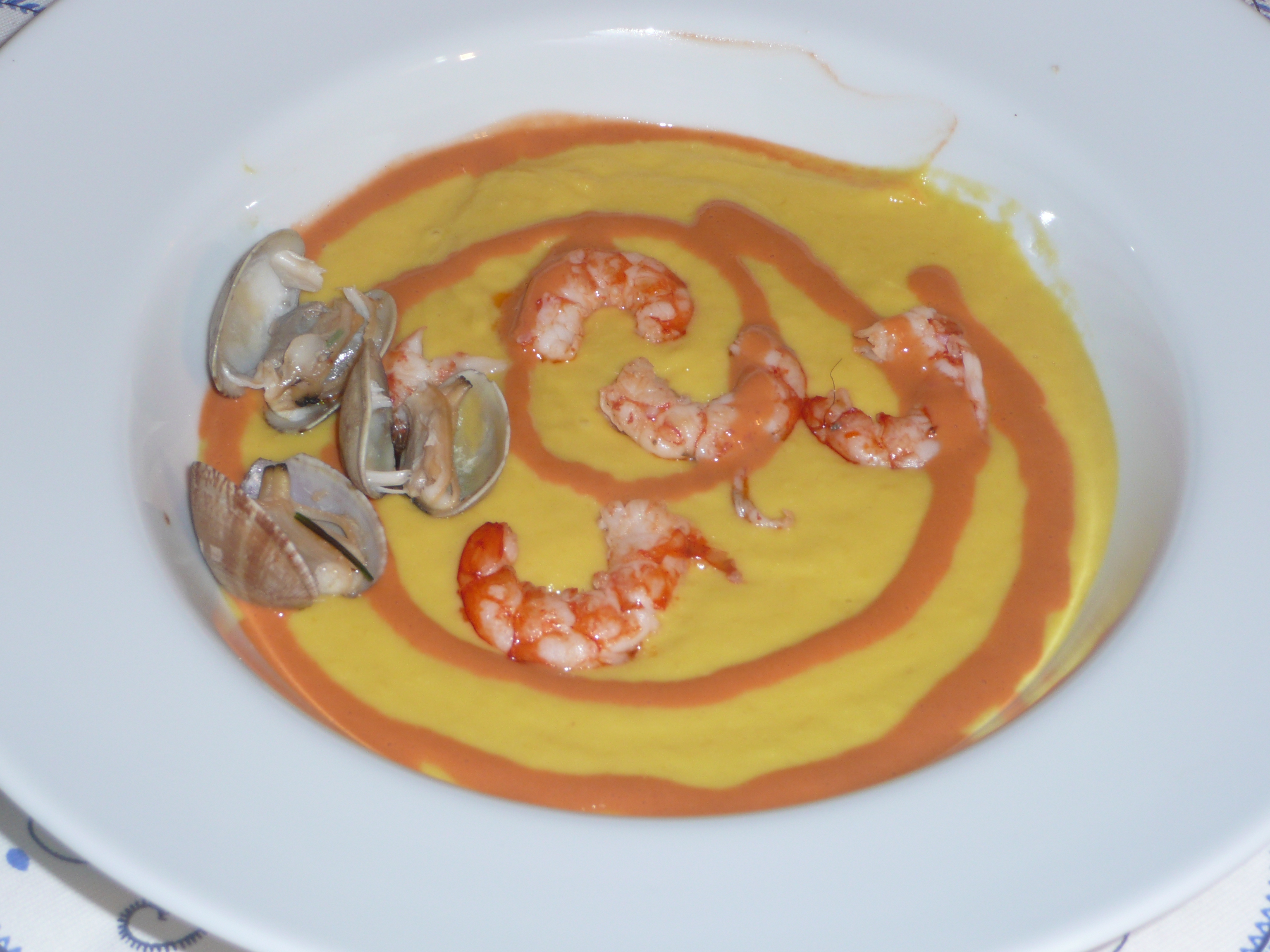 Ponemos la crema de maíz en un plato grande hondo (del tipo de servir la pasta), en el borde ponemos dos almejas y una cola de carabinero. Decoramos con el biberón de aceite de carabineros por encima de la crema