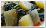 Una vez cocidas las acelgas y las patatas, se escurren y se sofríen en una sartén grande, con un poco de aceite de oliva y ajo picado, rehogándolo todo unos tres minutos.
